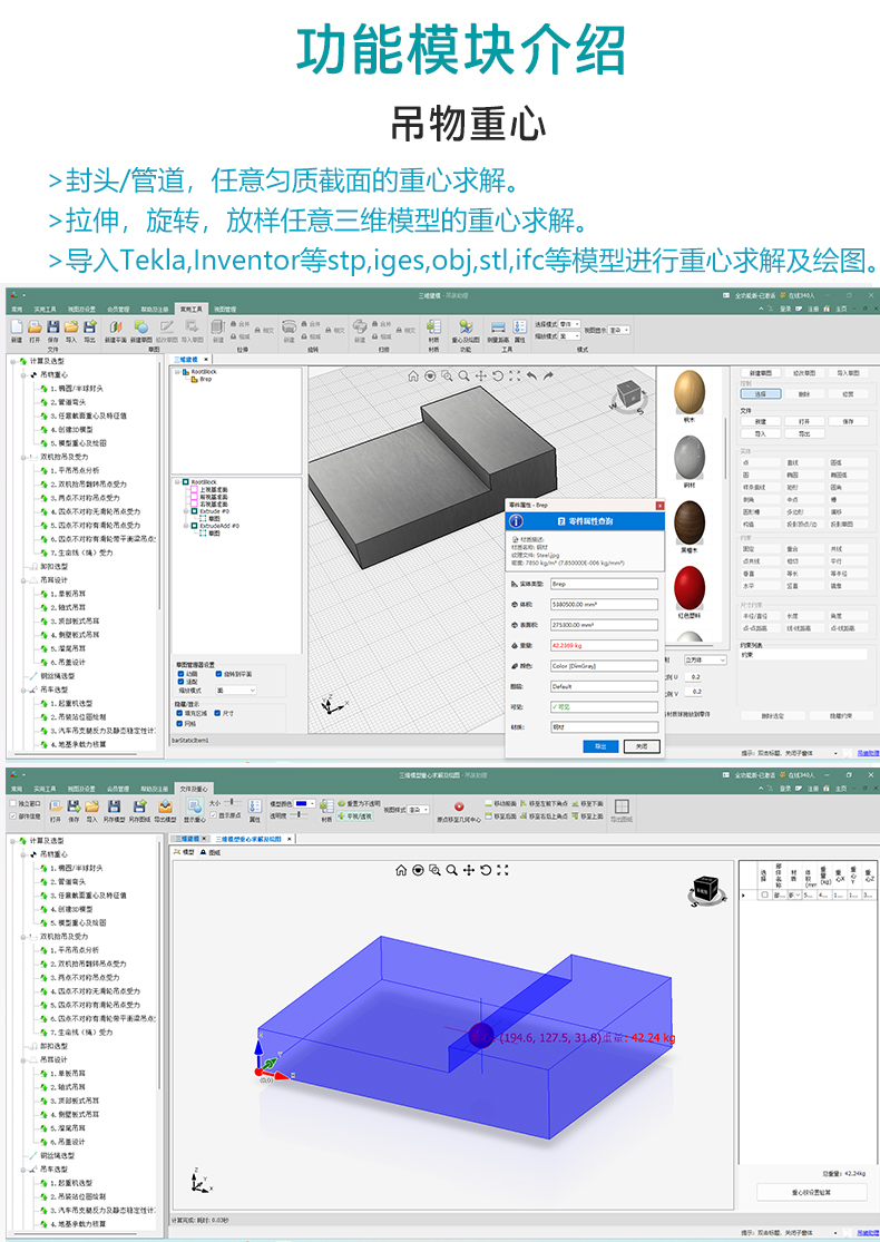 3.增加三维模型重心查看及绘图模块,可以导入Tekla,Inventor等模型查看重心和绘制重心图;